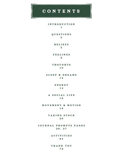 a journal dedicated to taking stock of one's life, habits, beliefs, feelings, thinking patterns, and more.